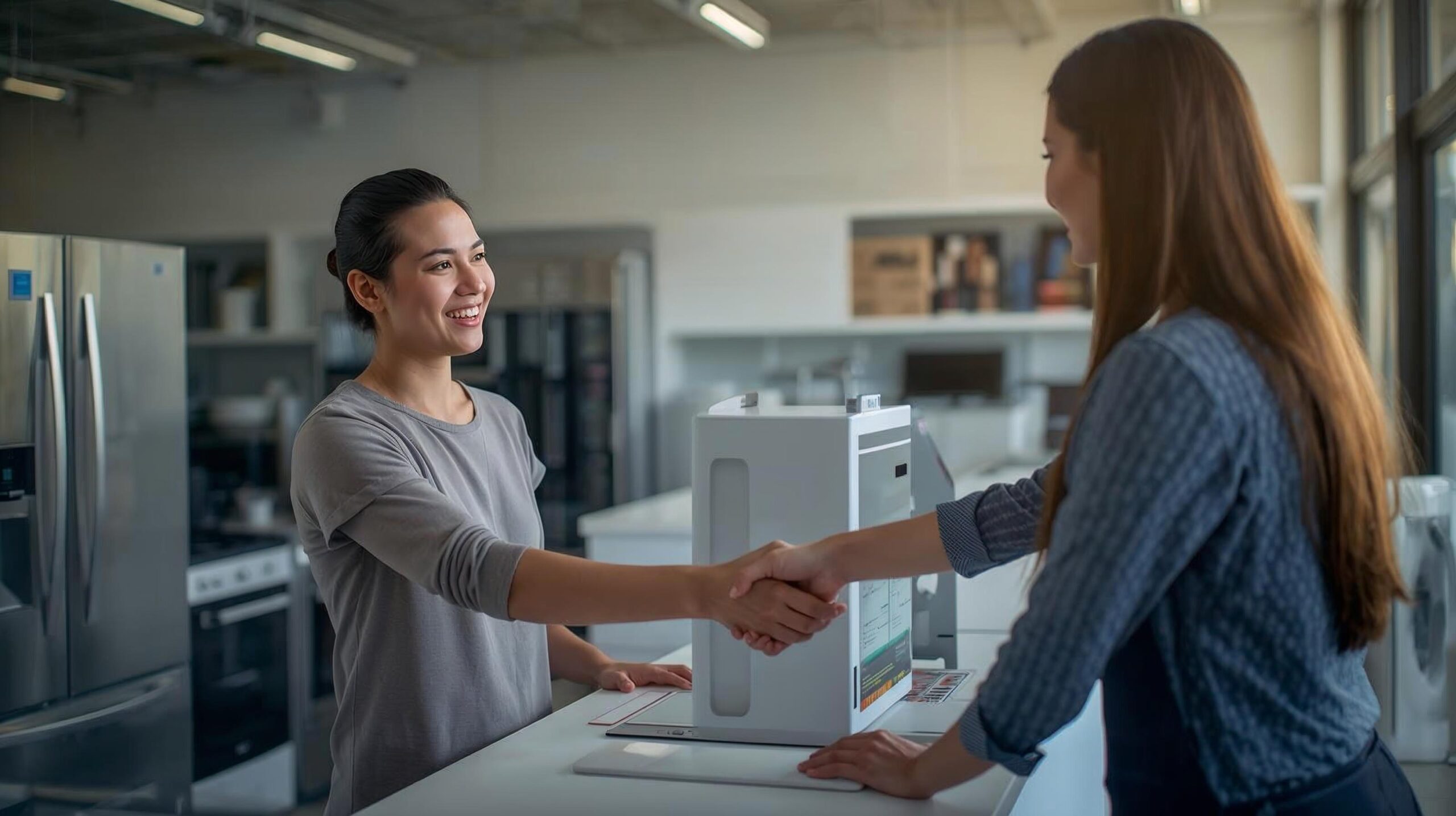 O cliente pesquisa produtos e ofertas online na vitrine digital e encontra sua loja, produtos e cupons de desconto. Ele termina sua jornada usando o cupom de desconto no balcão da sua loja física para comprar seus produtos